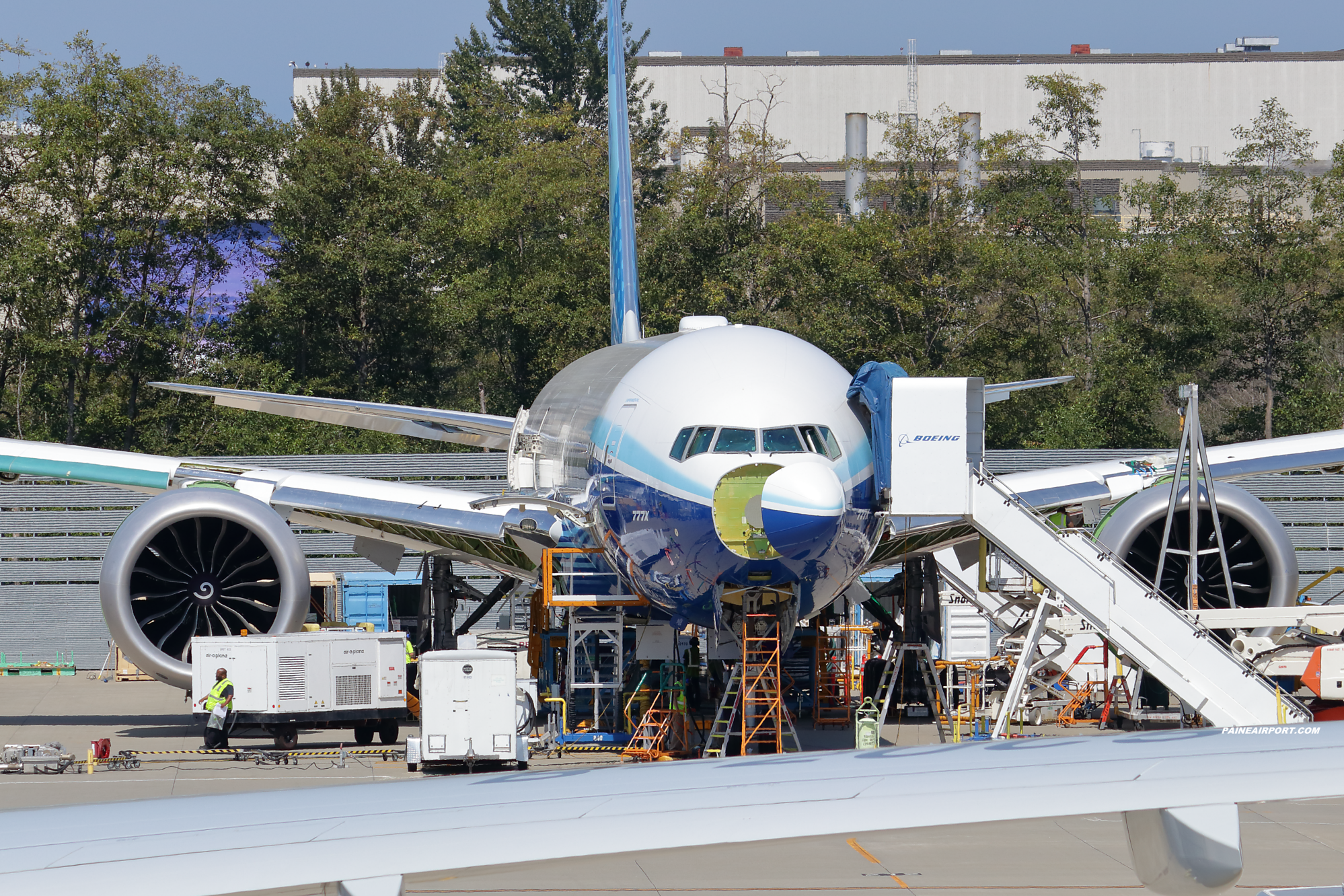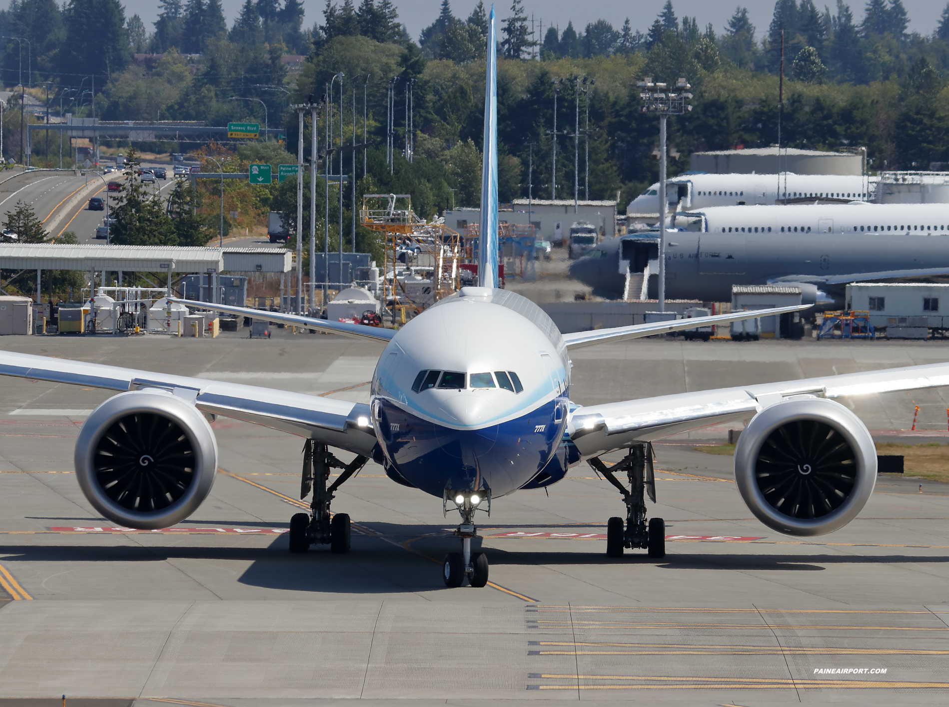 777-9 N779XW on the flightline after taxi checks for ground handling and folding wingtip operation.